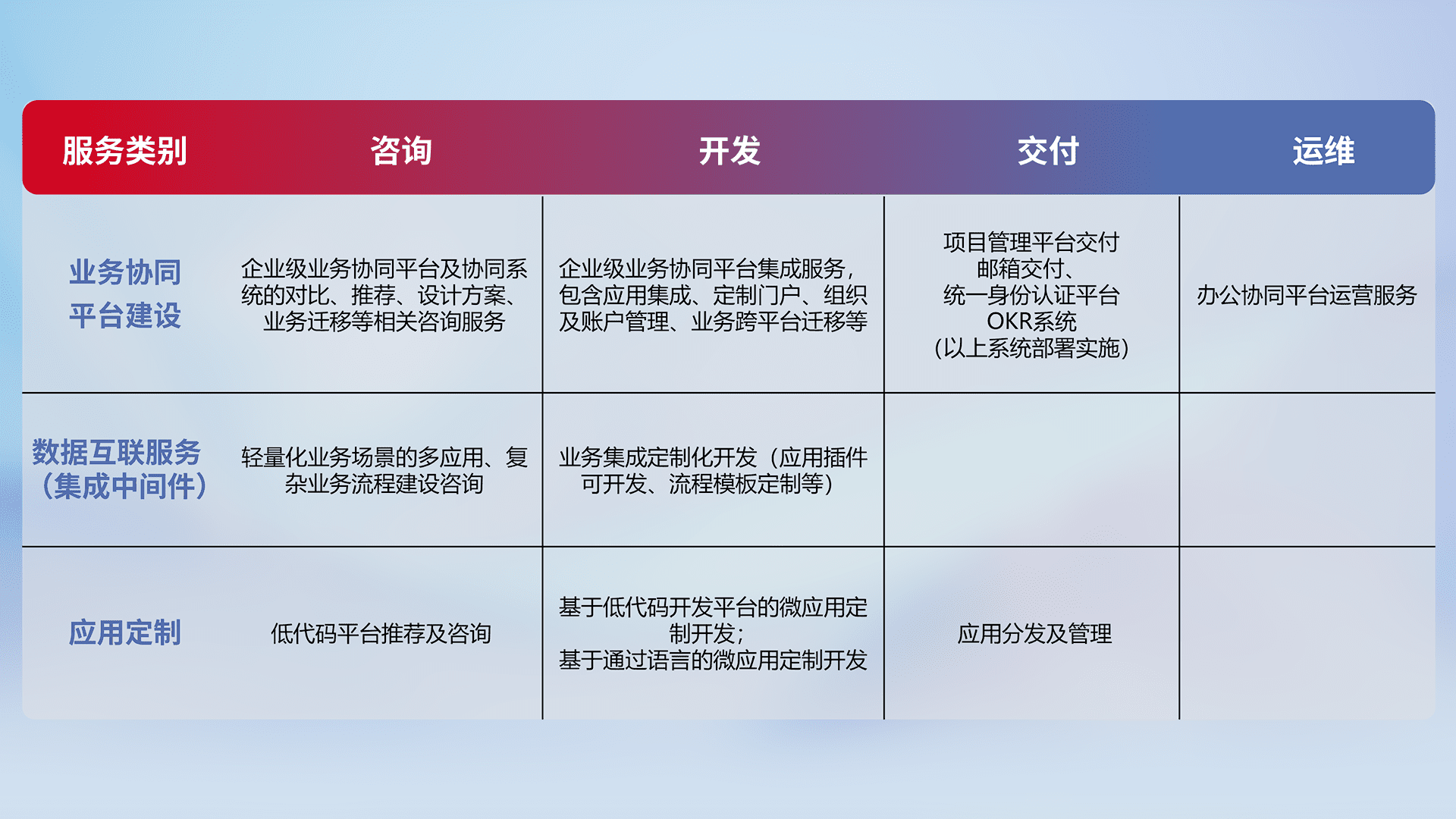针对钉钉、、、、企微、、、、IDaas等平台级产品提供产品的规划、、、方案、、交付、、、、定制化开发等服务,,,,实现如统一协同办公、、、智能客户服务、、、混合会议管理、、智能数据查询、、、、等业务场景,,,,实现数字化转型。。。。
