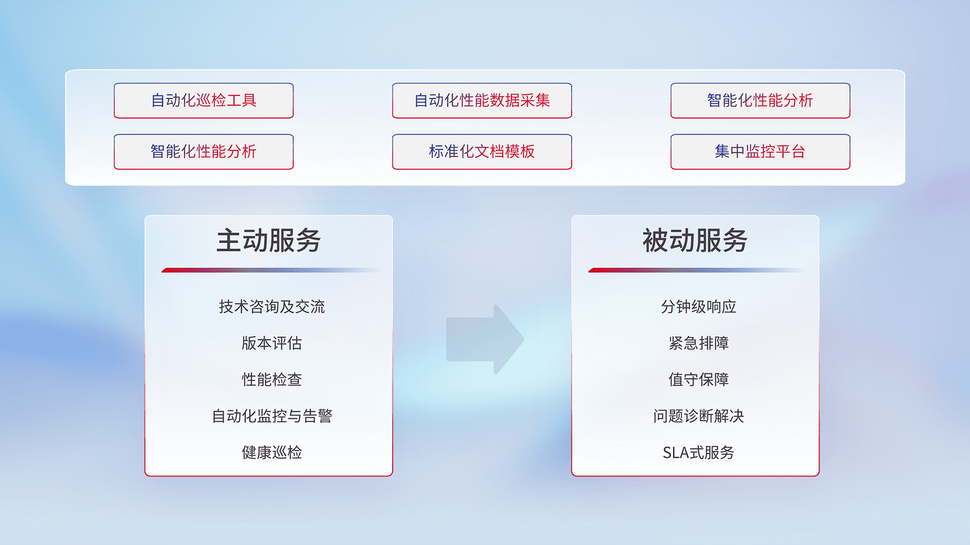 智能化工具和标准化文档,,保障服务质量,,,提供主动服务(包含技术咨询、、、版本评估、、性能检查、、、、自动化监控与告警、、健康巡检)和被动服务包含(分钟级响应、、紧急排障、、、值守保障、、问题诊断解决、、、SLA服务)。。