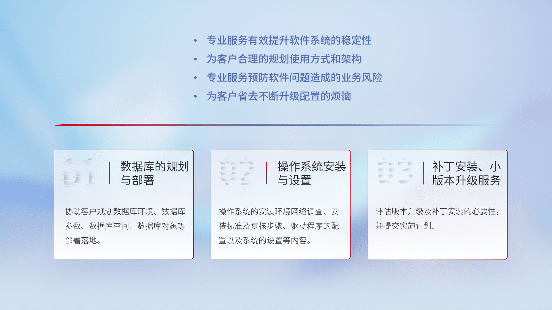为客户提供软件规模升级、、、快速部署、、、按需配置的专业服务,,,从数据库的规划与部署到操作系统的安装与设置,,再到补丁安装和小版本升级提供支持。。