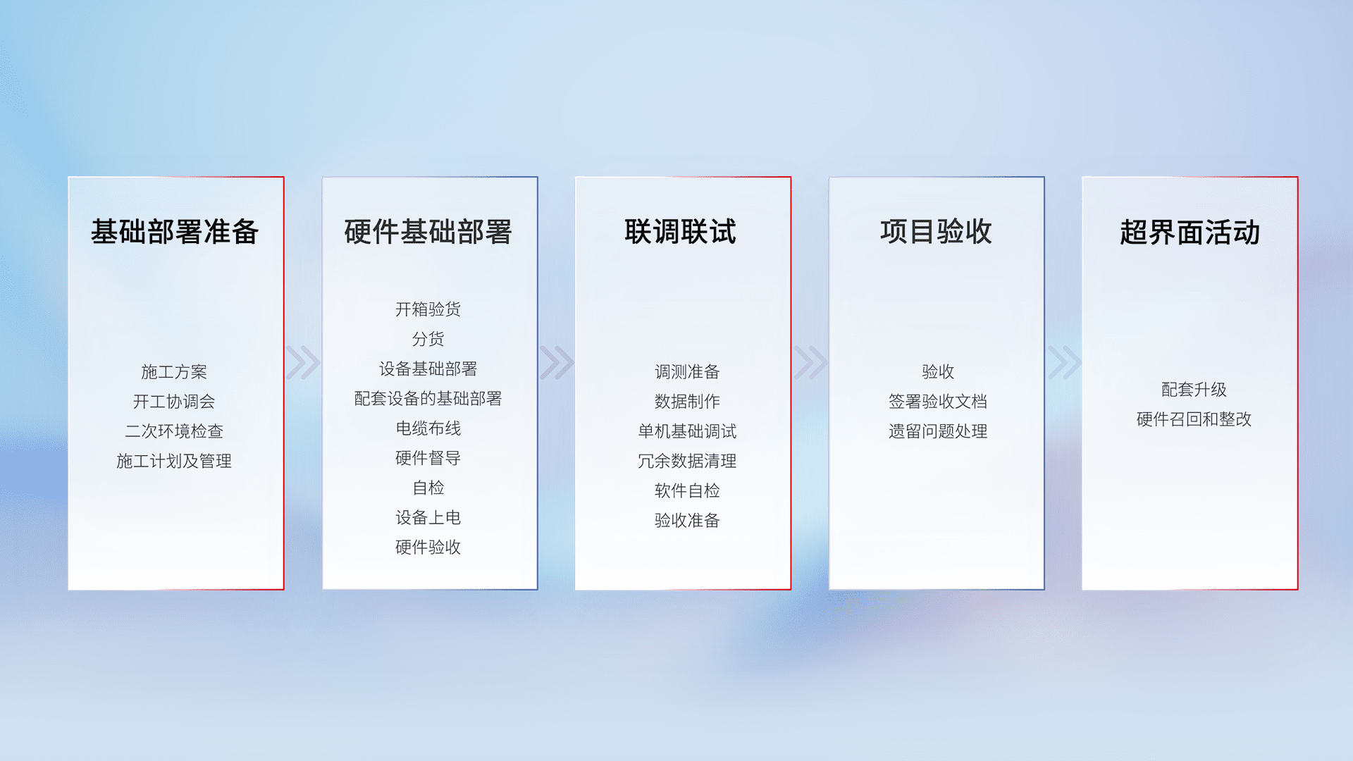 从基础部署准备、、、、硬件基础部署、、联调联试、、、、项目验收、、、越界面活动的全过程可追溯,,,保证施工质量和进度。。。